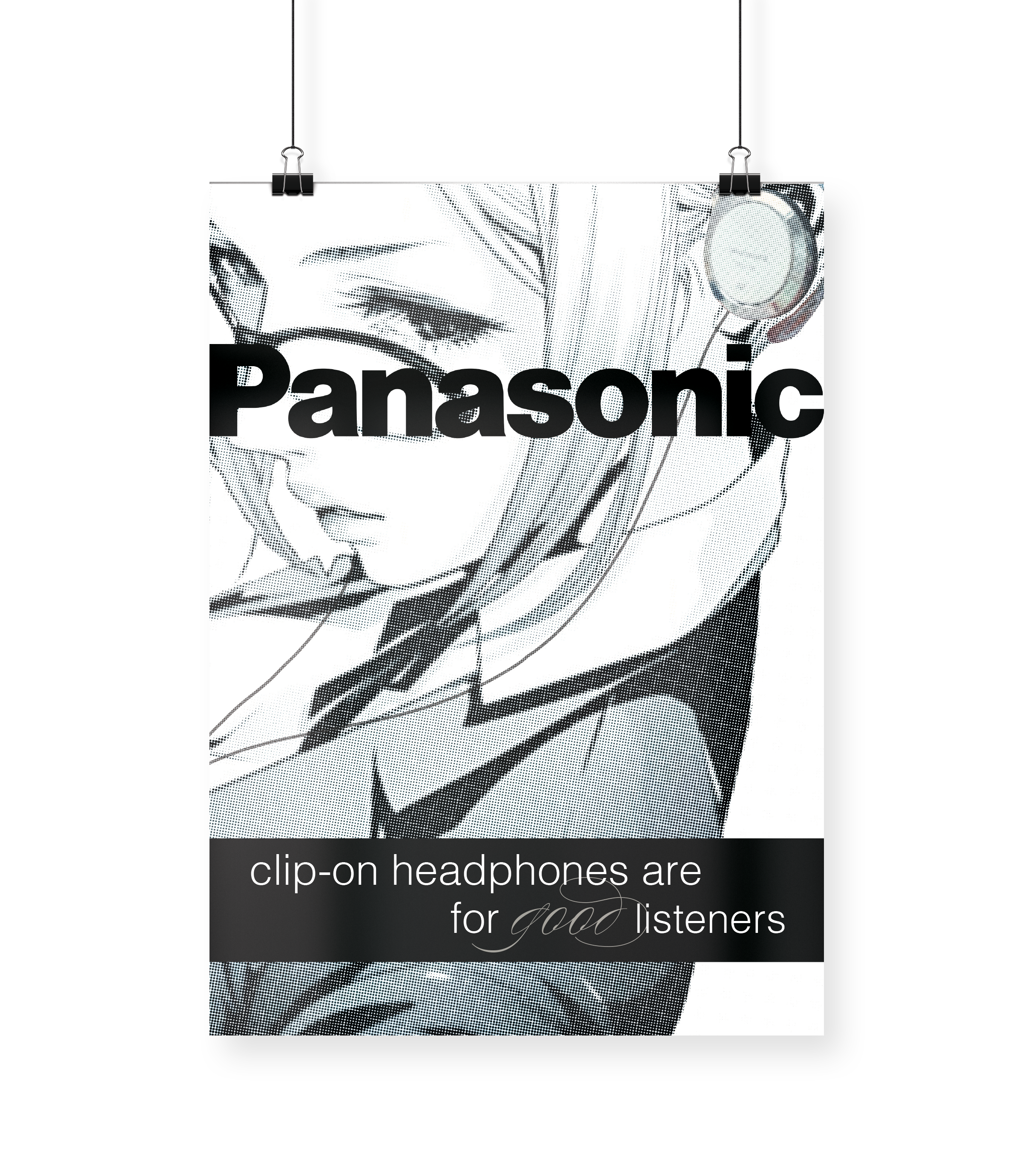 My BA thesis focused on how Apple uses graphic design to persuade consumers to buy its products. After identifying some key elements of Apple’s marketing, I applied them to Apple’s competitor, Panasonic’s marketing. The goal of my project was to sell a material aspiration rather than a commodity, creating a world in which one’s life cannot go on without a product. In this case, the product was Panasonic clip-on headphones.